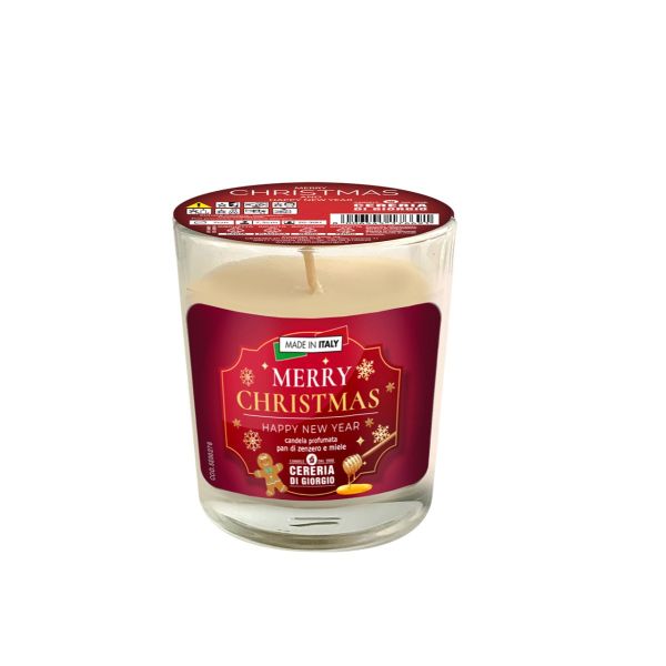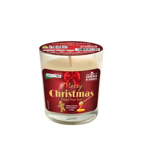 Candela in bicchiere diam. 7 cm h. 7,5 cm profumata al miele e pan di zenzero - Merry Christmas