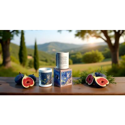 Candela Vegetale Vegana profumata in bicchiere in vaso di porcellana con decorazione artistica - Collezione Naive - Sardegna - Fico - 44 ORE