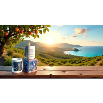 Candela Vegetale Vegana profumata in bicchiere in vaso di porcellana con decorazione artistica - Collezione Naive - Sardegna- 44 ORE